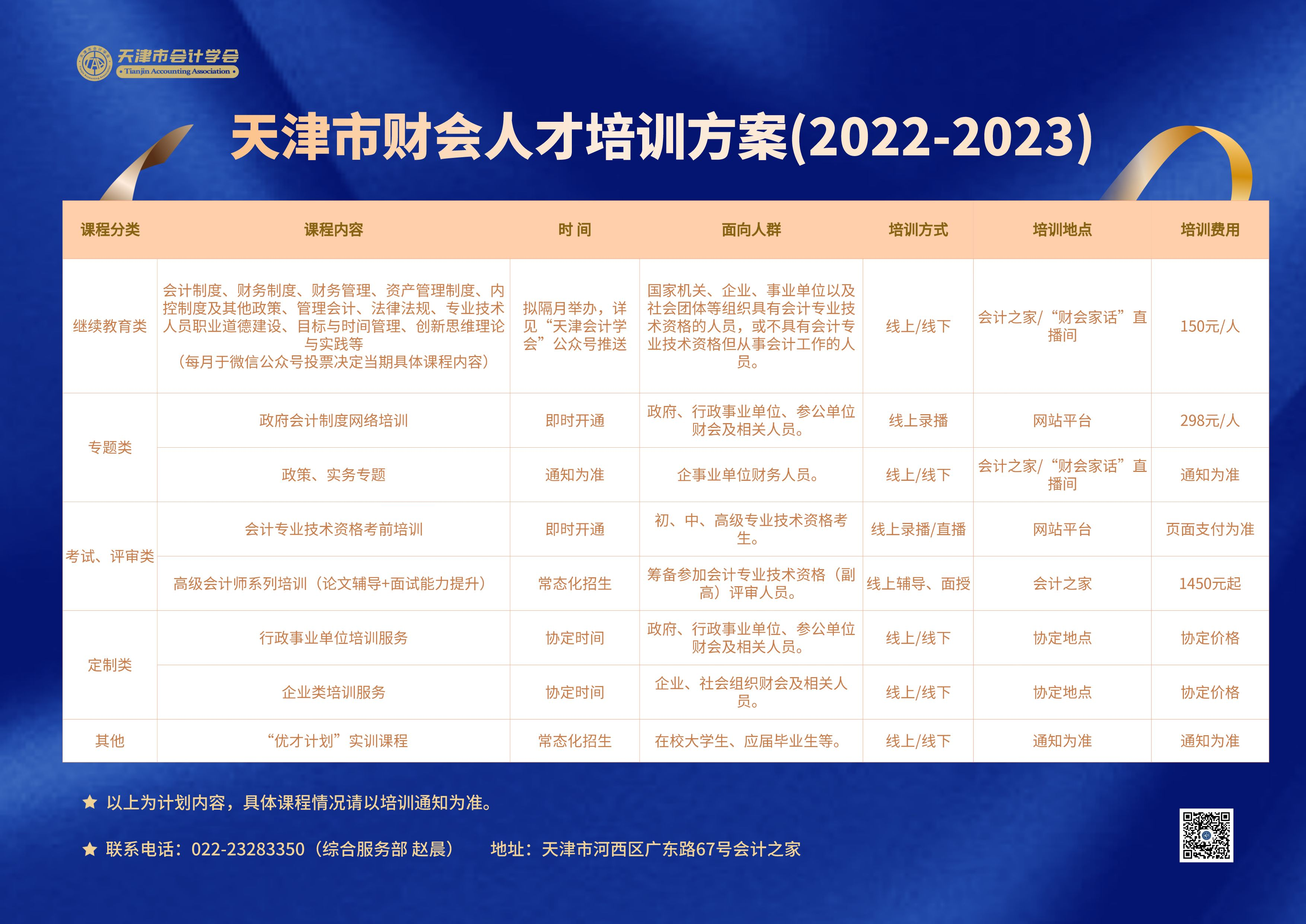 为贯彻落实财政部《会计改革与发展“十四五”规划纲要》和《会计行业人才发展规划(2021—2025)》文件精神,促进我市会计人才发展,履行行业学会应尽的义务,根据《天津市会计学会2022年度工作要点》要求,经行业主管部门审核批准,特制定《天津市财会人才培训方案(2022-2023)》,旨在提升企事业单位财务管理水平,促进企事业单位转型升级,培养精于实务、善于管理的全方面财会人才,望相关单位组织人员积极参与。