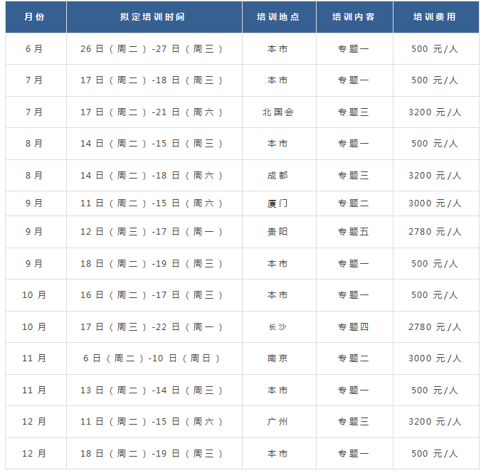具体报名方式将在每期课程开始前30天于我会官网“培训信息-培训通知”栏目及微信公众平台发布,请您关注。