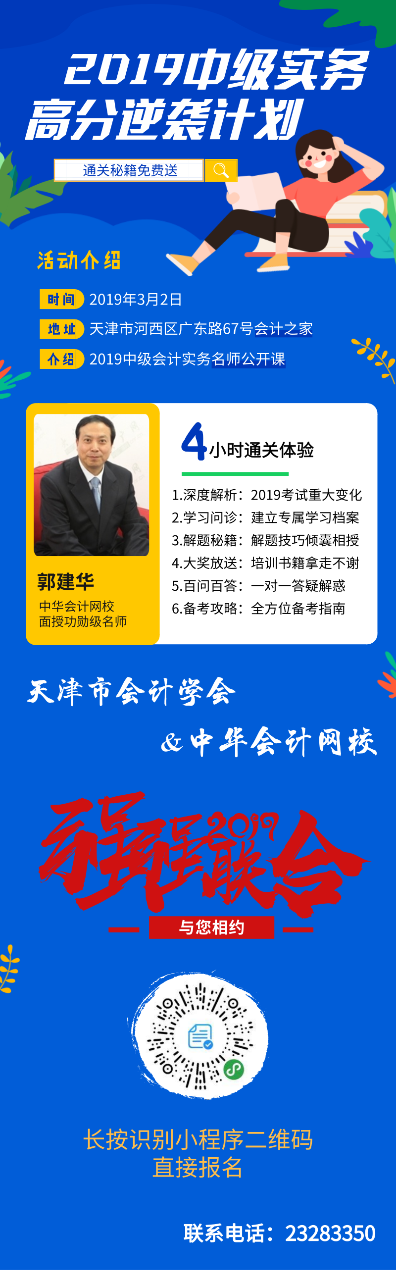 为协助我市2019年中级会计职称考生深入解读考试重点,拟定学习计划,天津市会计学会联合中华会计网校定于2019年3月2日(周六)举办“2019中级会计职称通关无忧名师公开课”,现将有关事项通知如下: