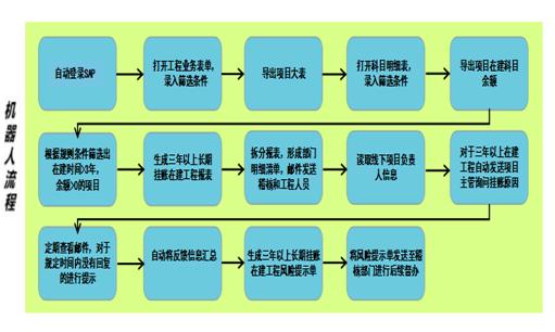 在稽核过程中,将RPA(机器人流程自动化)技术创新应用在财务稽核领域,选取三年以上长期挂账工程清理作为RPA具体应用的场景。通过设定机器人程序,使机器人代替人工执行基于一定规则的重复性指令的程序,帮助确定疑点问题、整合汇总反馈疑点、辅助稽核人员分析问题并提示风险,是公司创新和丰富财务稽核工作手段和方式的一个重要特色亮点。(见图4)